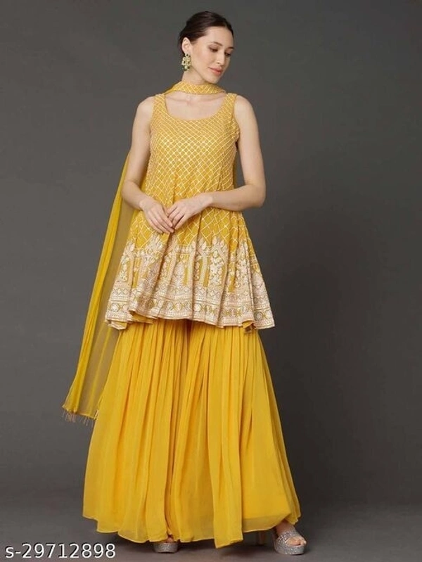 semi-Stitched Suits Top Fabric: Georgette Lining Fabric: Crepe Bottom Fabric: Georgette Dupatta Fabric: Georgette Pattern: Embroidered Multipack: Single Yashika Fashion Women's Yellow Georgette Palazzo Suit Sizes: Free Size (Top Bust Size: Up To 34 in, Top Length Size: 40 in, Bottom Length Size: 2 m, Dupatta Length Size: 2.2 m)