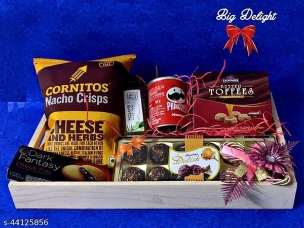 Big Delight Gift Hamper for any occasion Festive or Wedding contains (12 Pieces of Imported Chocolates+ 1 Nachos+ 1 Sapphire toffee pack+1 Juice+ 1 Dark Fantasy+1 Pringles+ 1 Wooden tray)