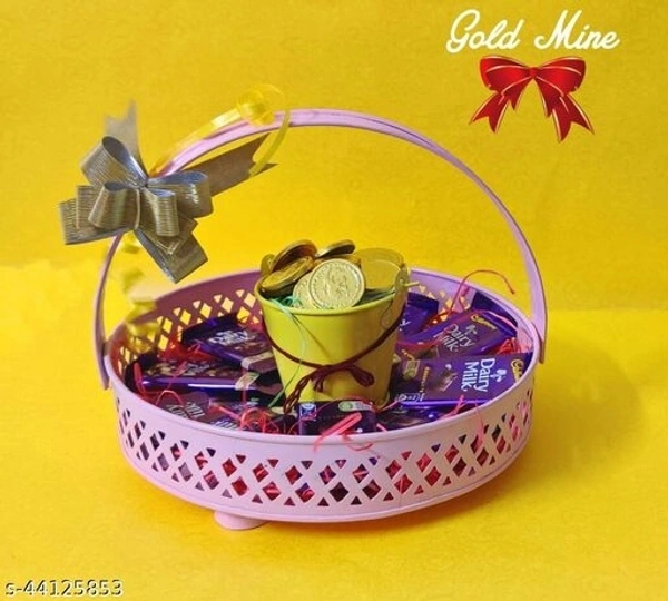 Gold Mine Gift Hamper for any occasion Festive or Wedding contains ( 10 cadbury chocolates + 9 piece of imported gold coins chocolate + 1 rakhi + 1 metal pink tray) Added Preservatives: No Capacity: 200-300gm Container Type: Pack Maximum Shelf Life: 24 months Organic: Yes Gold Mine Gift Hamper for any occasion Festive or Wedding contains ( 10 cadbury chocolates + 9 piece of imported gold coins chocolate + 1 rakhi + 1 metal pink tray)