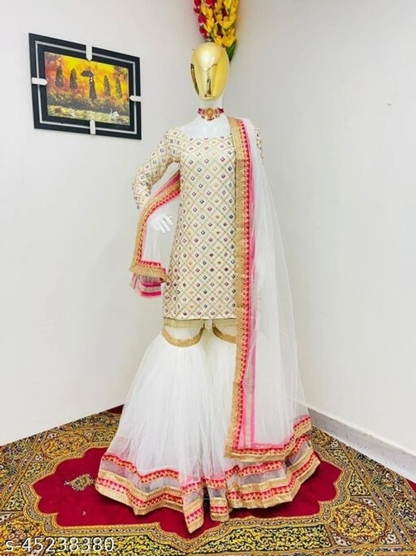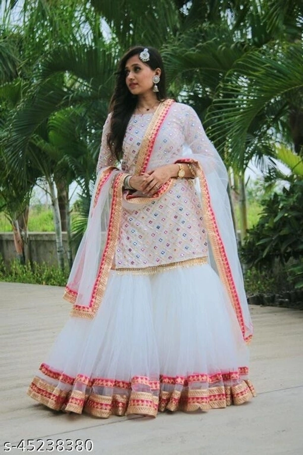 PLAZZO FABRICS* :GEORGETTE+SOFT NET WITH LESS EMBRODARY WORK *PLAZZO FIAR 20 MTR * TOP FABRIC* :FOX GORGETTE WITH DUBBLE SIQUNCE EMBROIDERY WORK WITH VAL LESS FULLY STITCHED *#TOP INAR * : Micro