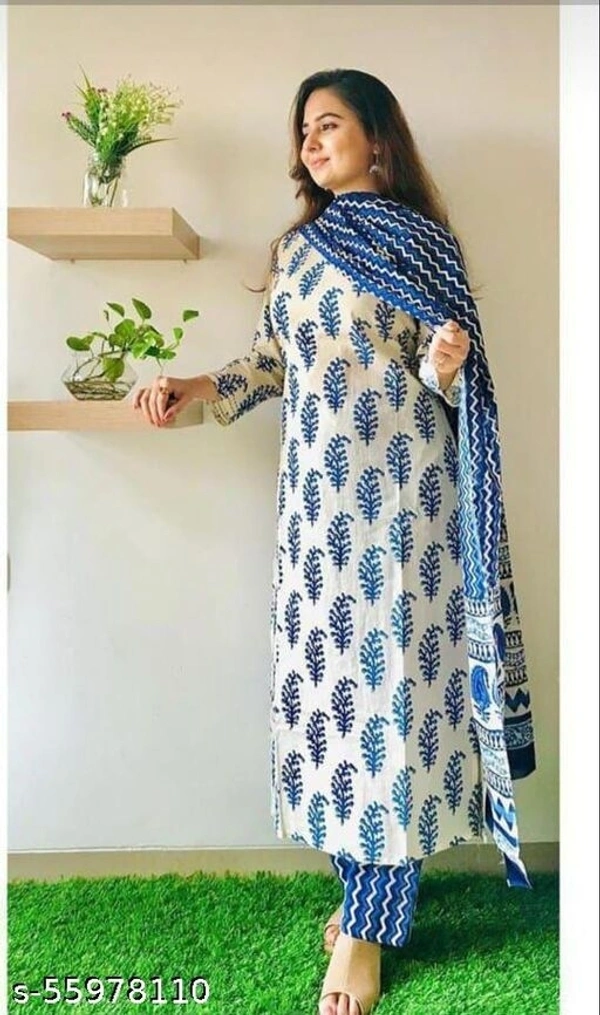 Kurta Fabric: Cotton Bottomwear Fabric: Cotton Fabric: Cotton Sleeve Length: Three-Quarter Sleeves Set Type: Kurta With Dupatta And Bottomwear Bottom Type: Pants Pattern: Printed Multipack: Single Sizes: XL (Duppatta Length Size: 2.25 m) L (Duppatta Length Size: 2.25 m) XXL (Duppatta Length Size: 2.25 m) M (Duppatta Length Size: 2.25 m)