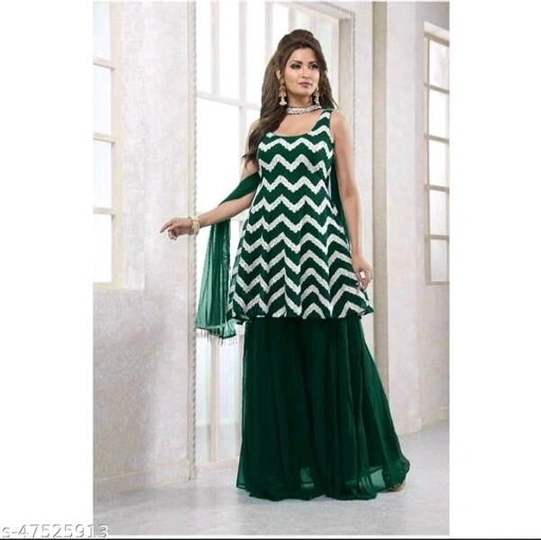 Kurta Fabric: Georgette Bottomwear Fabric: Georgette Fabric: Georgette Sleeve Length: Sleeveless Set Type: Kurta With Dupatta And Bottomwear Bottom Type: Sharara Pattern: Embroidered Multipack: Single