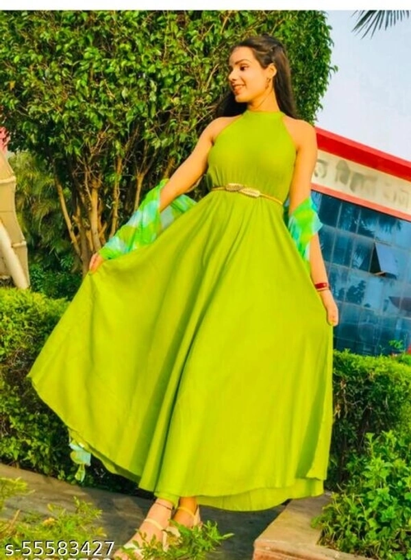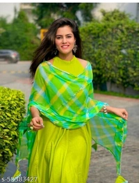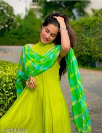 Trending lime green kurta set contains Rayon flared ankle length solid kurta & pant with green leheriya printed Nazmin dupatta worked with latkans. There could be a slightly variation in actual colour due to different screen resolution.