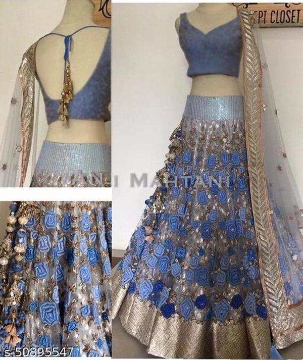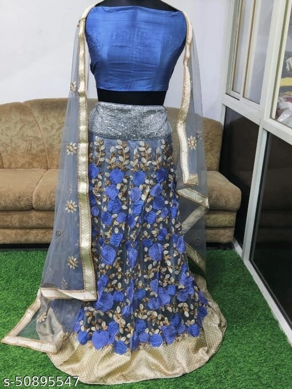 Topwear Fabric: Crepe Bottomwear Fabric: Dupion Silk Dupatta Fabric: Net Set type: Choli And Dupatta Top Print or Pattern Type: Embroidered Bottom Print or Pattern Type: Embroidered Dupatta Print or Pattern Type: Embellished Sizes: Semi Stitched (Lehenga Waist Size: 42 m, Lehenga Length Size: 42 m, Duppatta Length Size: 2.5 m)